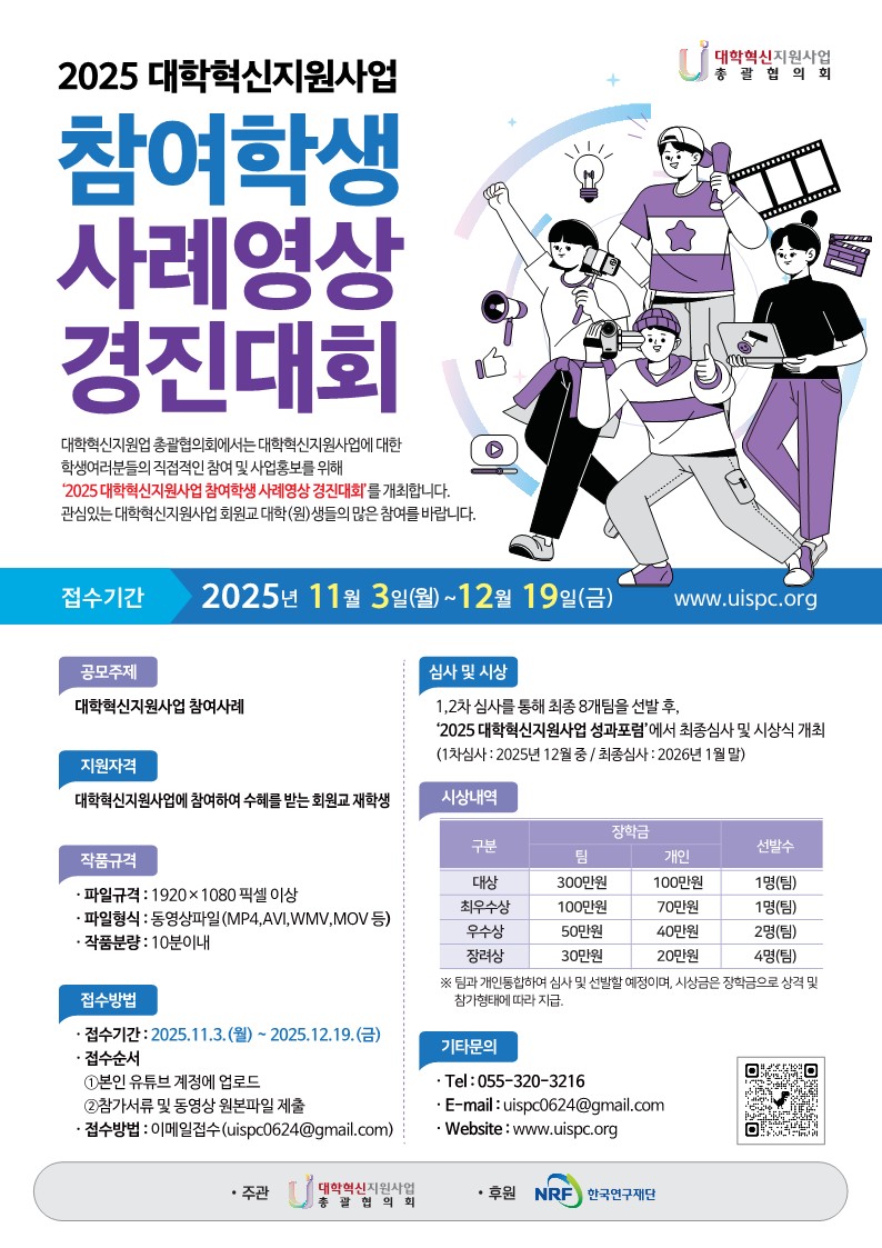 가. 공 모 명: 2025 대학혁신지원사업 참여학생 사례영상 경진대회 나. 모집대상: 대학혁신지원사업에 참여하여 수혜를 받은 재학생 다. 접수기간: 2025. 11. 3.(월) ~ 2025. 12. 19.(금) 라. 접수방법: 참가서류 및 동영상 파일을 이메일(uispc0624@gmail.com)로 접수 마. 세부사항: [붙임1]의 개최 안내공문 참조 바. 문 의: 대학혁신지원사업 총괄협의회 사무국 (☎ 055-320-3216, uispc0624@gmail.com) 홈페이지 오류로 첨부파일이 올라가지 않고 있습니다 빠른 시일내로 추가 파일을 첨부파일로 게시해두겠습니다 |