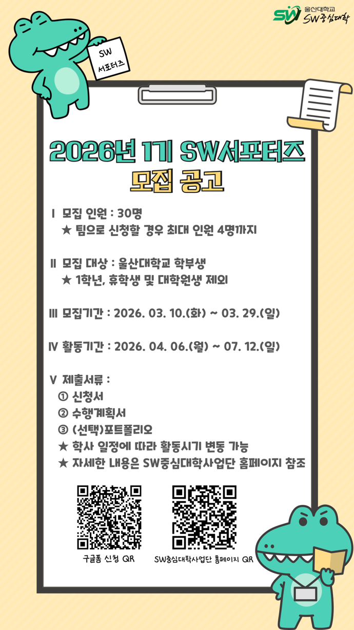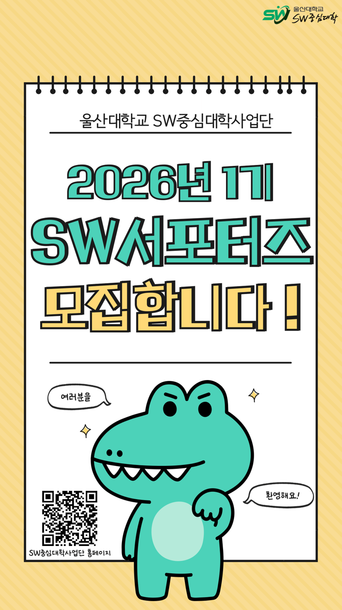 2026년 SW 서포터즈 26-1기 추가 모집합니다 ! ■ 활동기간(예정) : 2026. 04. 06.(월) ~ 07. 12.(일) ■ 모집기간 : 2026. 03. 10.(화) ~ 03. 29.(일) ■ 모집대상 : 울산대학교 본교 전체 학부(과) 재학생 ※ 1학년, 휴학생, 대학원생 참여불가 ■ 모집인원 : 약 30명(팀) ■ 지원자격 - 울산대학교를 사랑하고 SW중심대학사업단 홍보에 관심이 많은 학생 - 개인 SNS(블로그, 인스타그램, 유튜브, 틱톡 등)를 활발히 운영 중인 학생
