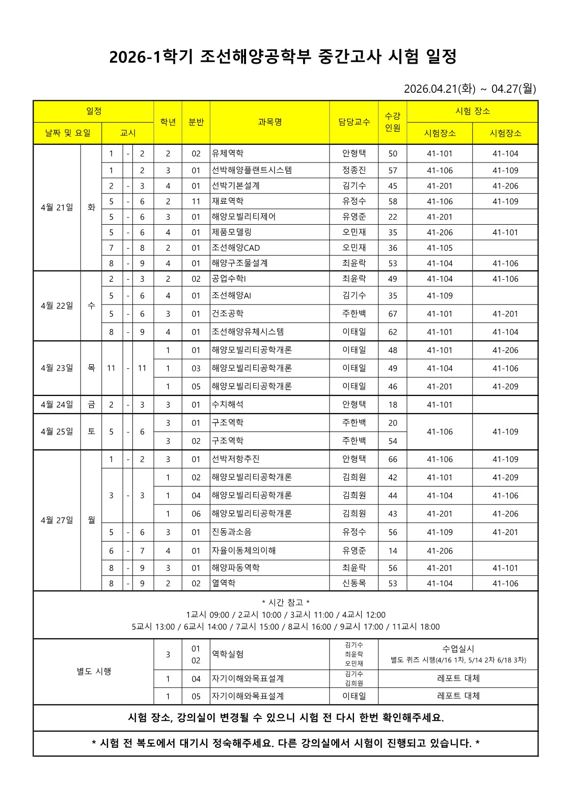 | 2026-1학기 조선해양공학부 중간고사 시험 일정 안내 | |||||