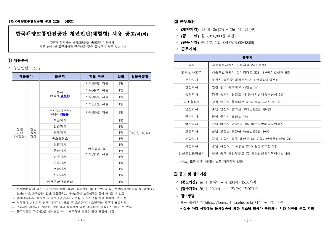 한국해양교통안전공단 청년인턴(체험형) 채용 공고 안내