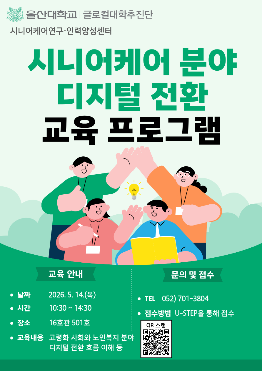 글로컬대학추진단 시니어케어연구·인력양성센터에서는 예비 사회복지 인력의 시니어케어 기반 디지털 활용 역량 강화를 위해 재학생들을 대상으로 시니어케어 분야 디지털 전환 교육 프로그램을 운영합니다. 1. 교육개요 가. 교 육 명 : 시니어케어 분야 디지털 전환 교육 나. 교육일시 : 2026. 5. 14.(목) 10:30 ~ 14:30 다. 교육장소 : 울산대학교 16호관(아산도서관) 501호 라. 교육대상 : 본교 재학생 마. 교육내용 : 고령화 사회와 노인복지 분야 디지털 전환 개념 및 변화 흐름 이해 등