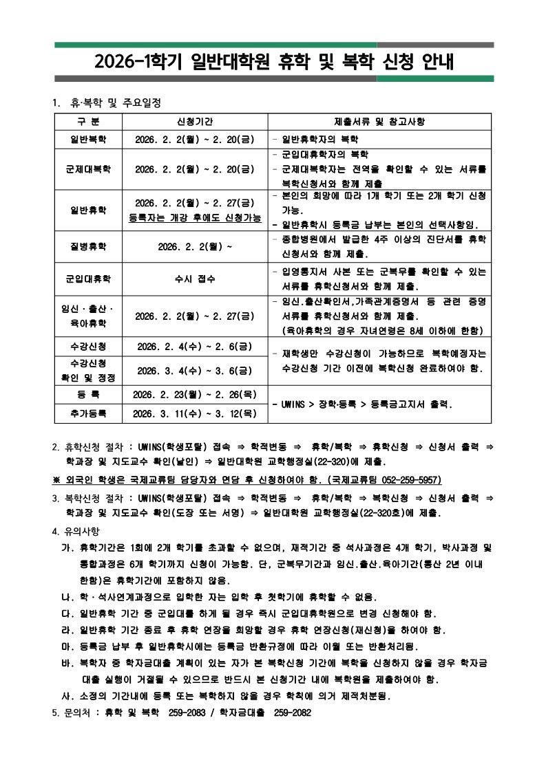 2026학년도 1학기 일반대학원 휴학 및 복학신청 안내
