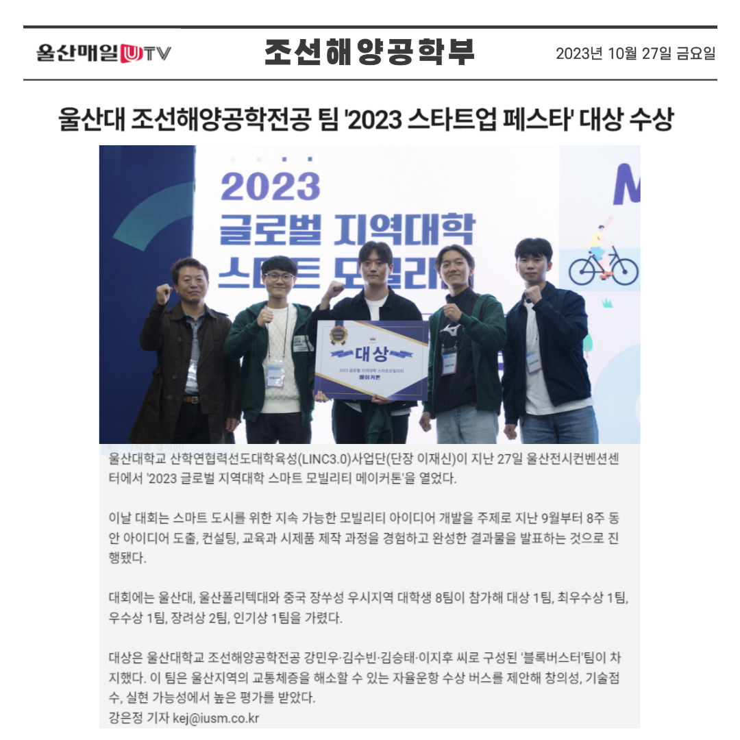 자율운항보트경진대회동아리 “울산대 글로벌 지역대학 스마트 모빌리티 메이커톤” 대회 수상