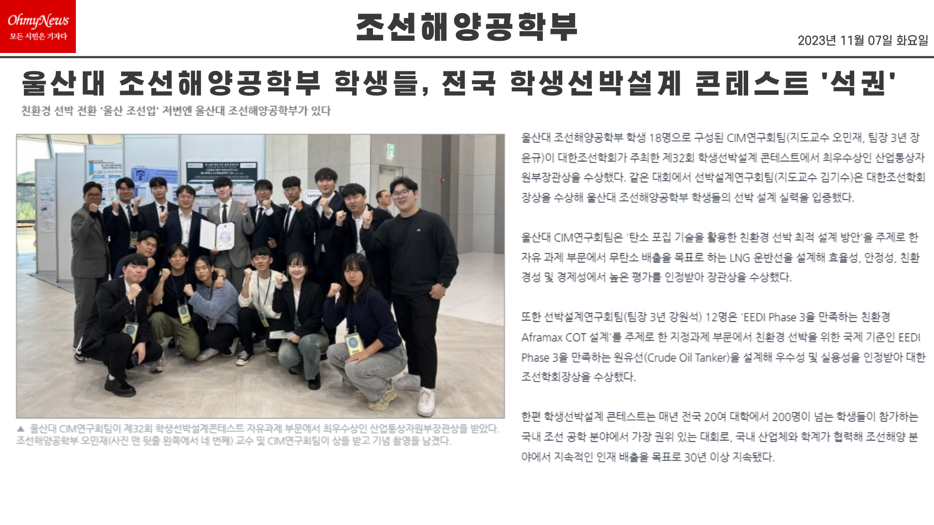 CIM 동아리 전국 학생선박설계콘테스트 최우수상 '산업통상자원부장관상' 수상