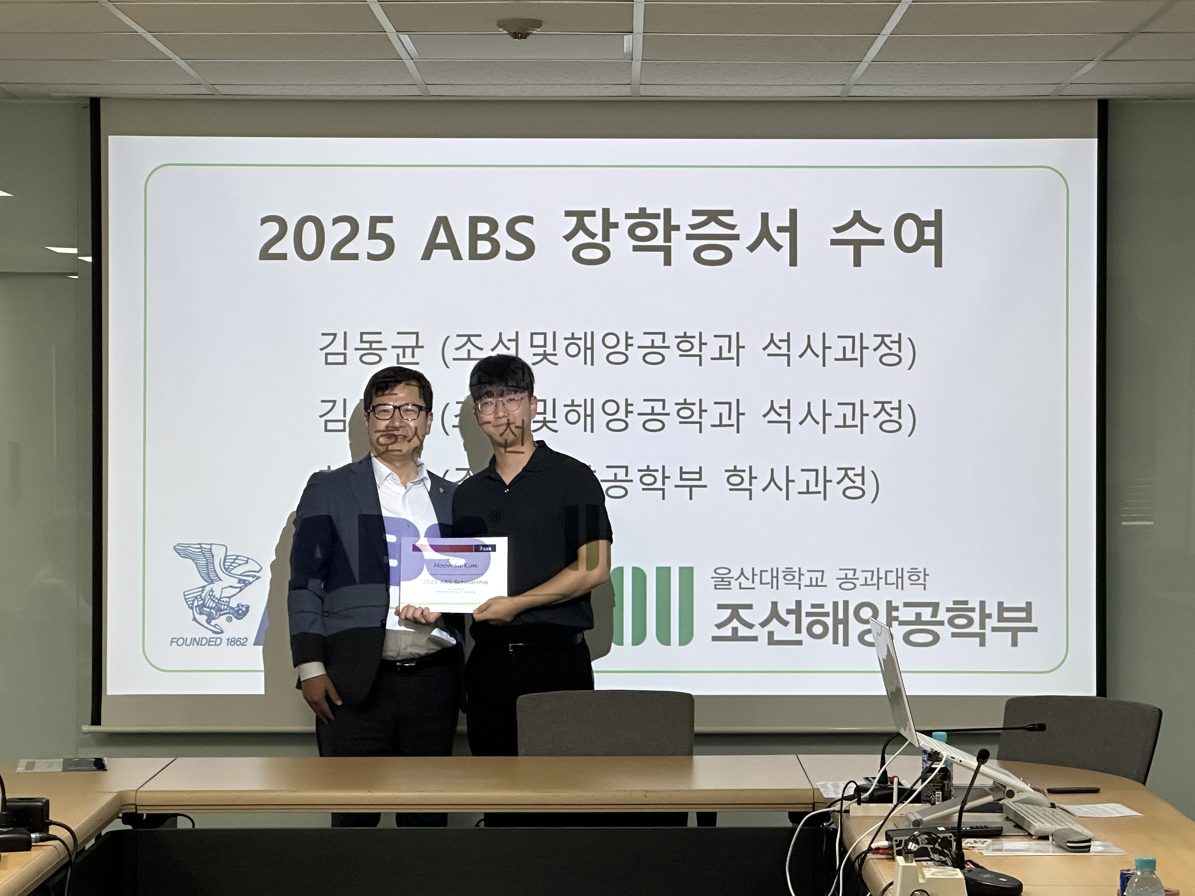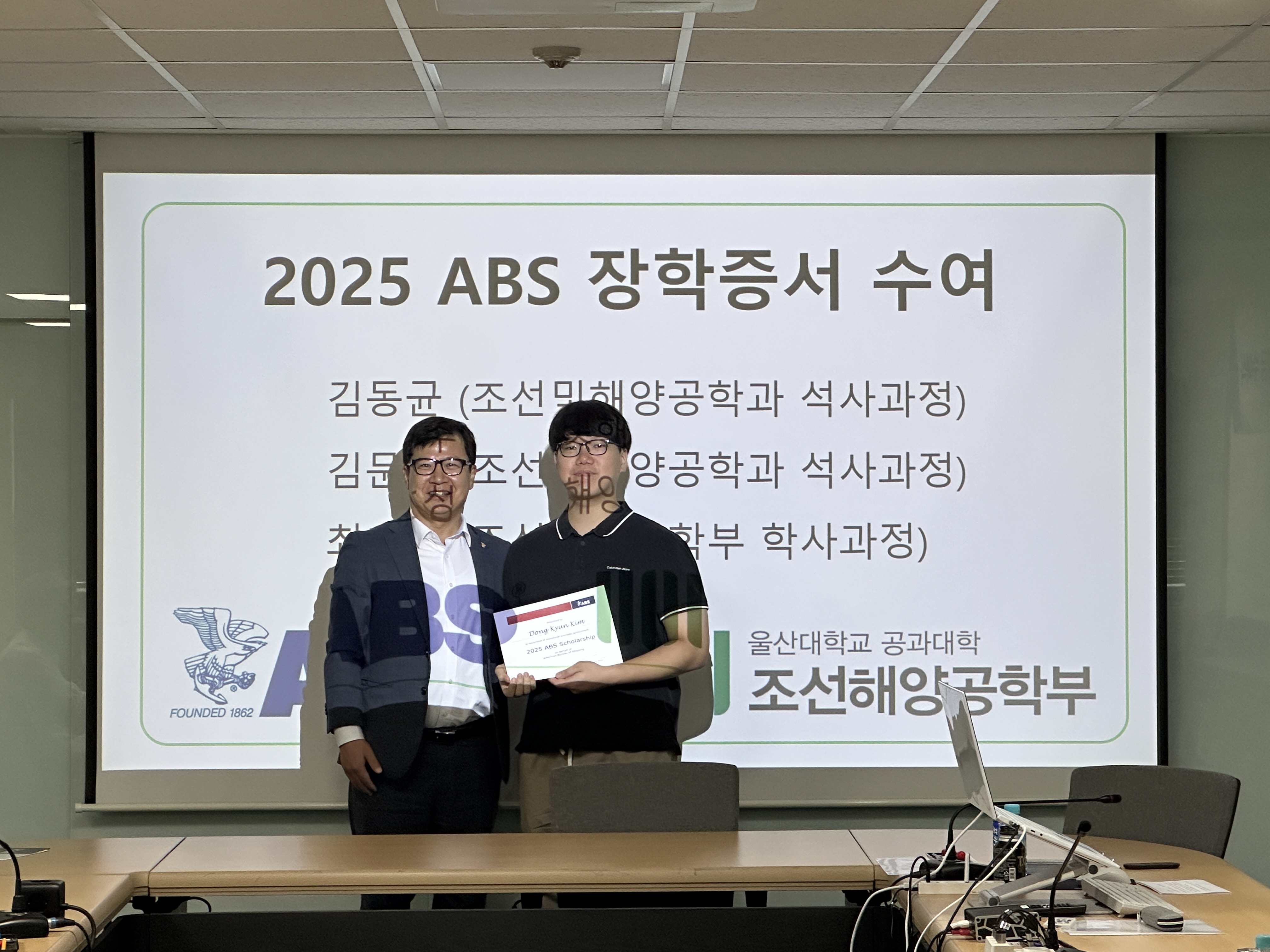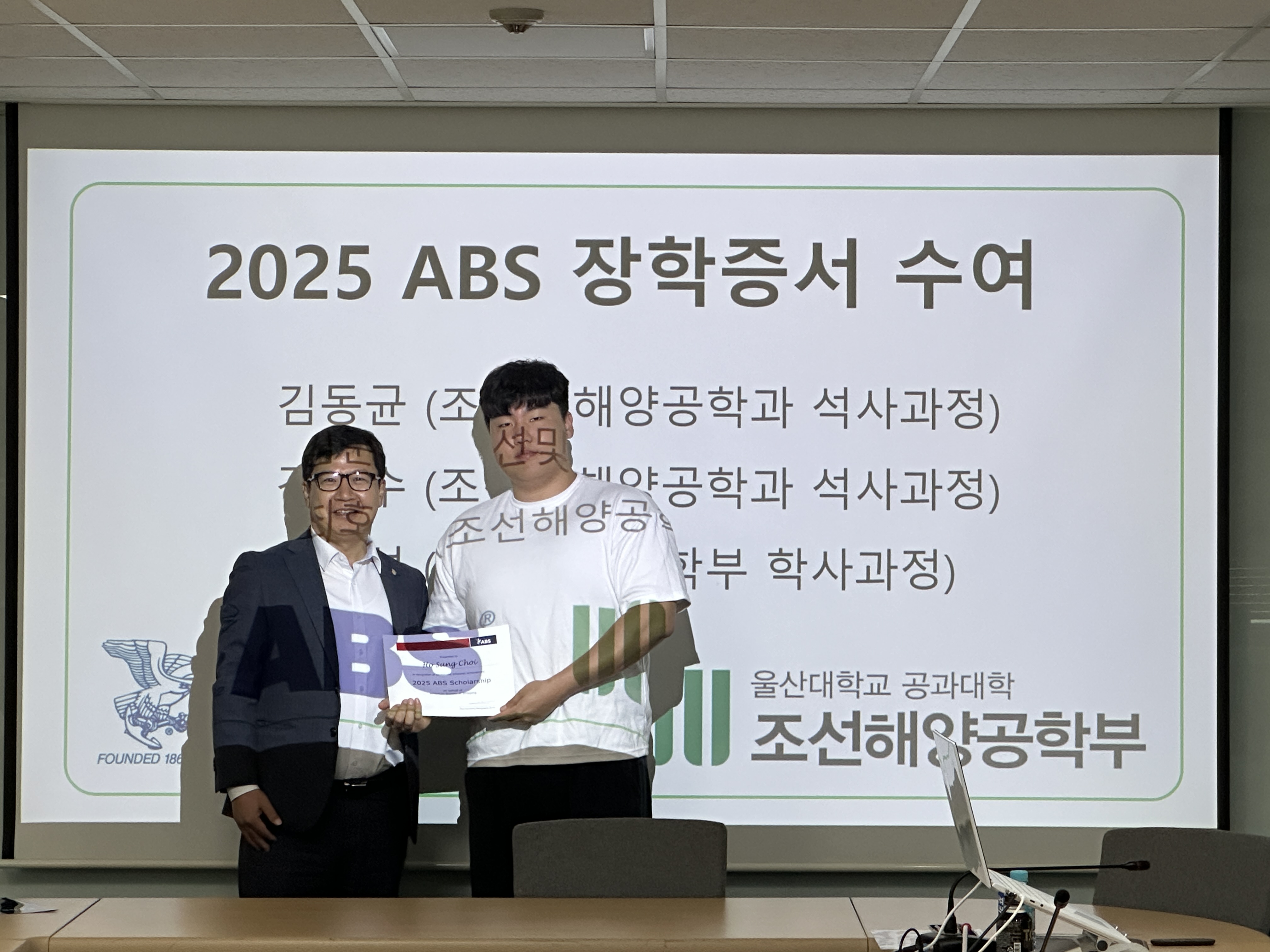 2025년 ABS 장학증서 수여식 일 시 : 2025년 9월 17일(수) 오전 11:00~12:00 장 소 : 조선해양공학관 41호관 301호 학부회의실 시상내역 ● 김동균 (석사과정) ● 김문수 (석사과정) ● 최호성 (학사과정) |