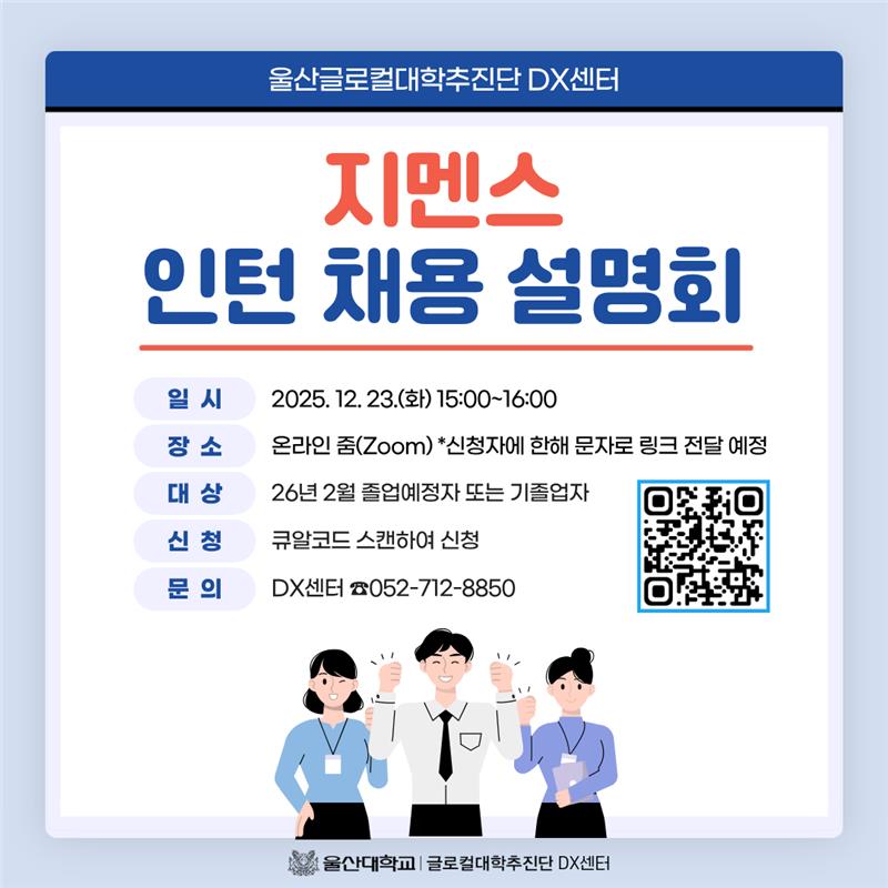 [글로컬대학추진단 DX센터] 지멘스 인턴 채용에 관심 있는 분들을 대상으로 인턴 채용 설명회를 진행합니다. 채용 절차, 모집 직무, 인턴십 전반에 대한 안내와 질의응답이 이루어질 예정이니 관심 있는 학생들의 많은 참여 바랍니다!
